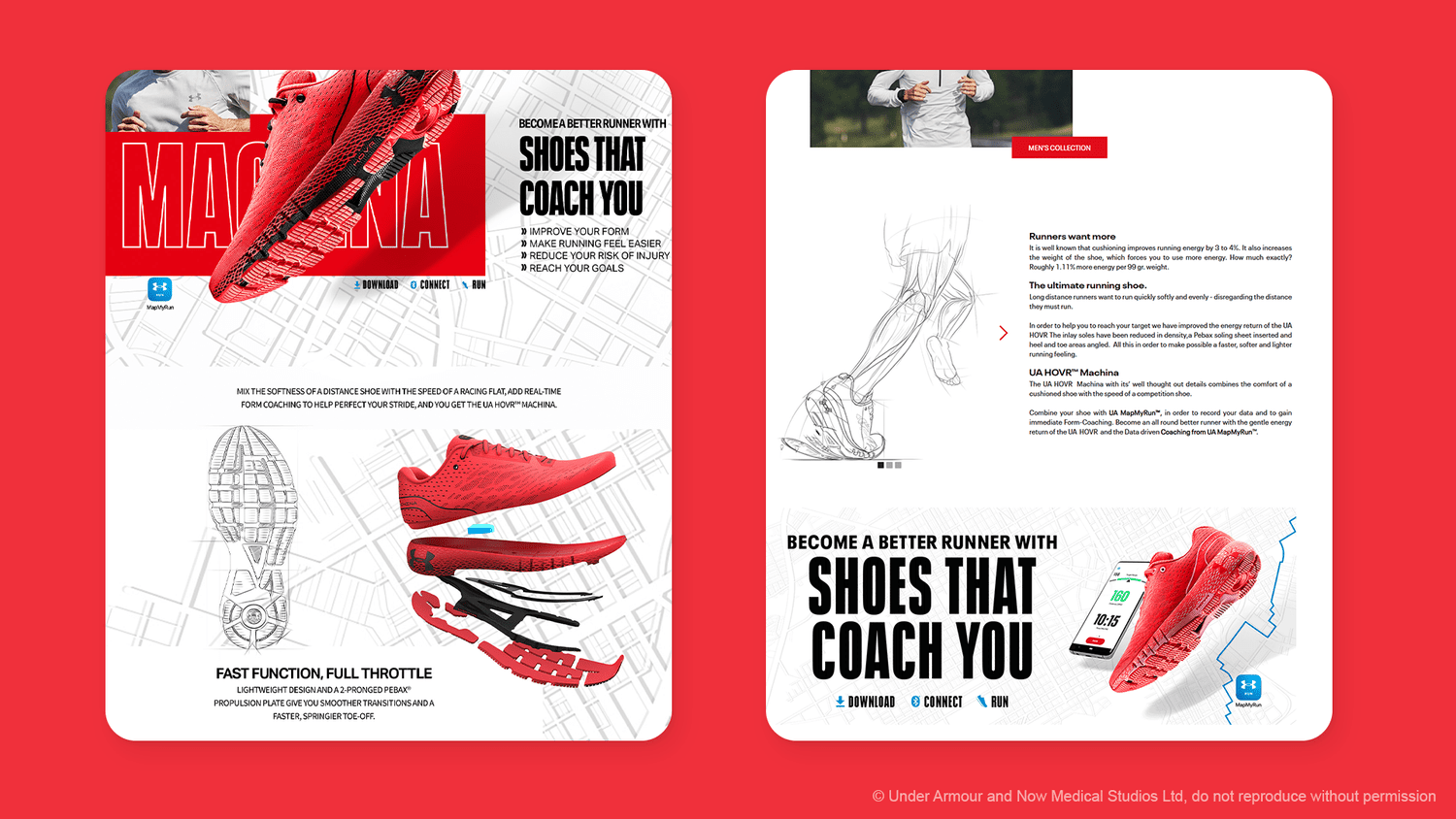 Now Medical Studios teamed up with the Under Armour UA HOVR creative team to create stylised medical illustrations that could be used as background artwork to help add to the overall brand and product story. UA’s HOVR Machina shoe is a design like no other running shoe. It’s build is created to optimise a runner’s gait, stability, and propulsion. Our role here was to dive in and illustrate the anatomy of a runner, a runner’s stride, optimal footstrike of a runner, phases of a run, as well as highlight the key features that create this technically advanced shoe.
