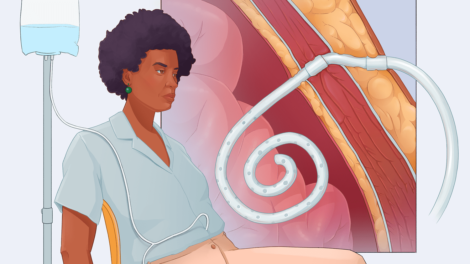 Medical illustration of a woman undergoing peritoneal dialysis