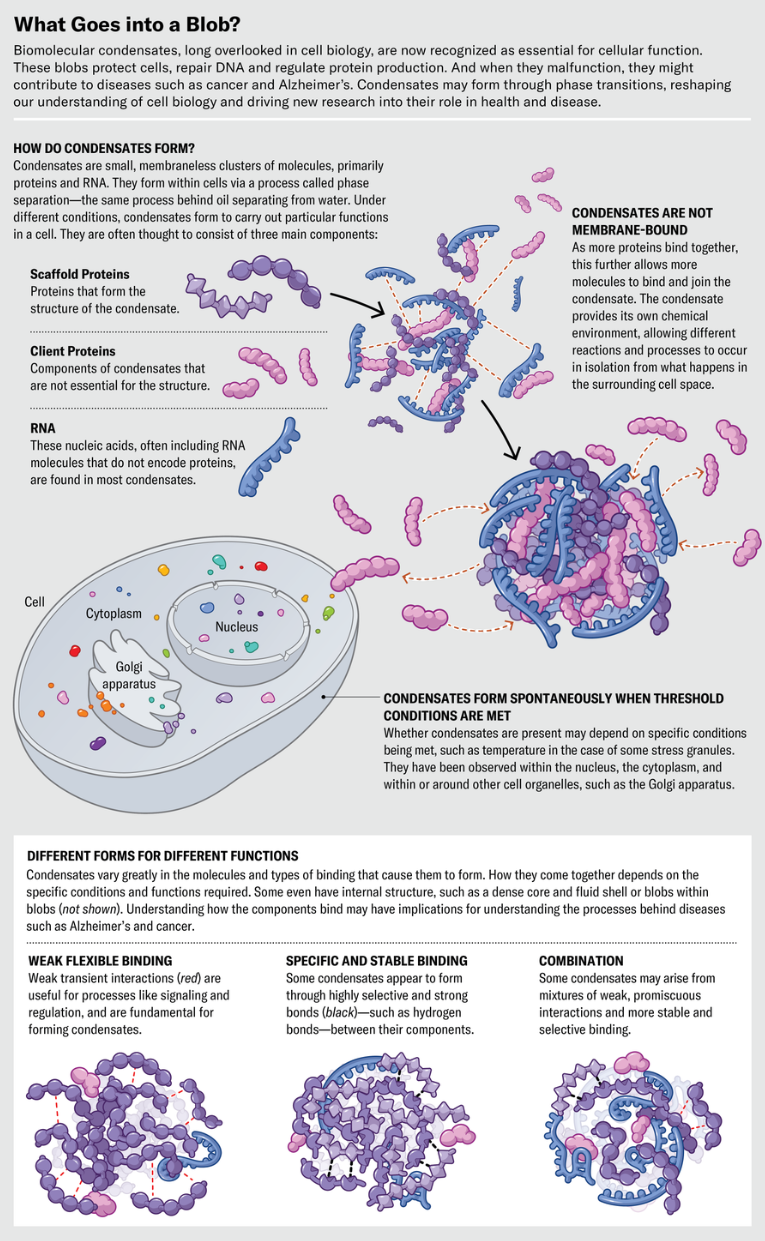 For this Scientific American feature, our team developed a visual editorial layout to accompany an article on biological condensates. Once overlooked, these dynamic cellular structures are now understood to be essential for processes like DNA repair, protein regulation, and cellular protection. Our team created concept sketches, vector illustrations, and a final composition to help illustrate the complex science behind phase transitions and their emerging role in both health and disease, including cancer and Alzheimer’s.